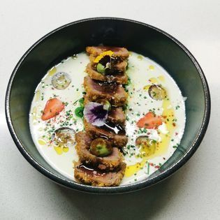 Tiras de wagyu con verduras de temporada en salsa Tonkatsu y arroz basmati: